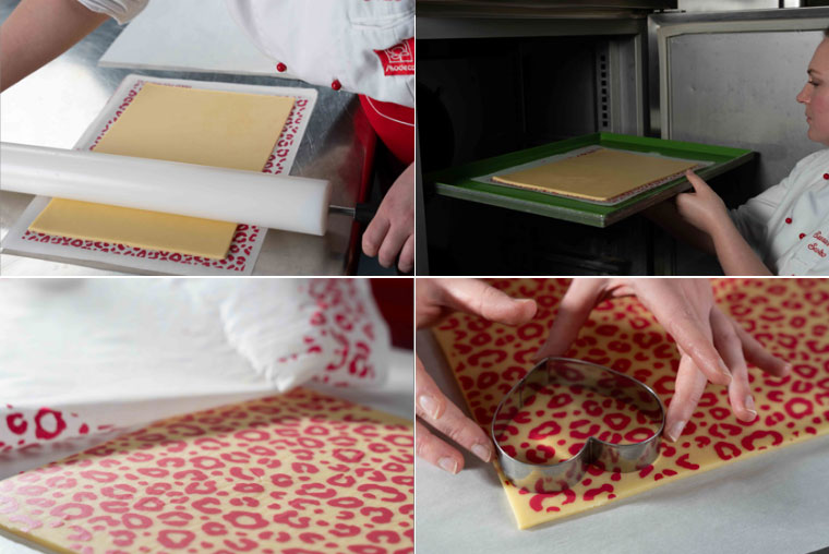 1. Wytnij folię transferową w pożądany kształt i umieść ją (zadrukowaną stroną do góry) na zimnej blasze do pieczenia lub foremce do ciasta.