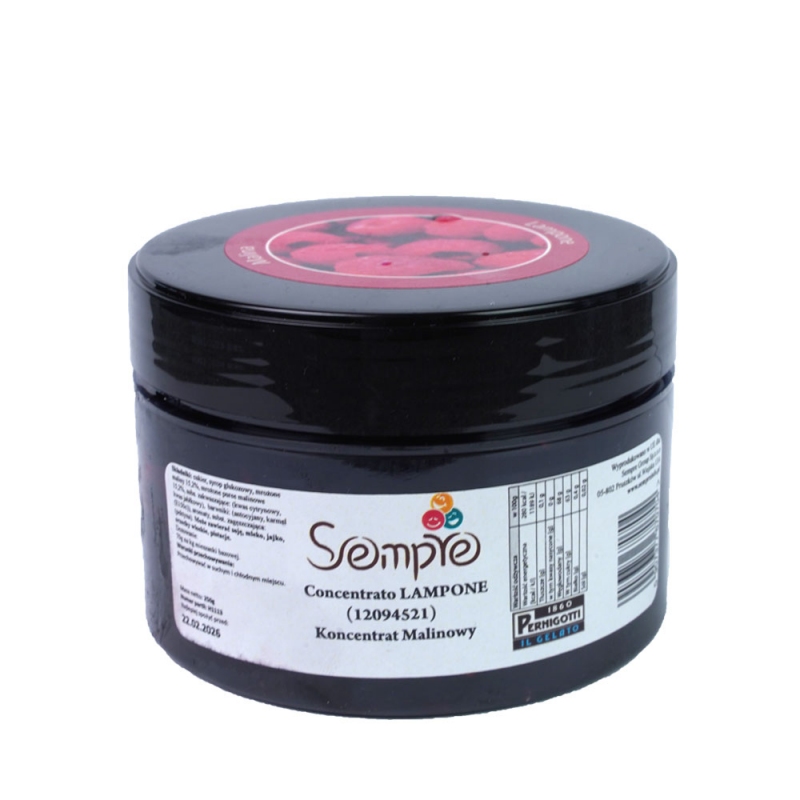 Pasta cukiernicza (koncentrat) Concentrato Lampone- o smaku malin, renomowanej włoskiej firmy PERNIGOTTI . To profesjonalna pasta wykonana z wysokiej jakości produktów (30% malina) . Nadaje intensywny malinowy smak kremom, nadzieniom, tortom i innym deserom.