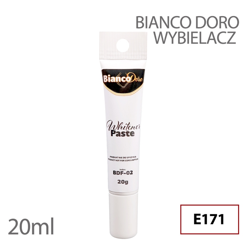 Mocny wybielacz w żelu, zawiera w swoim składzie Biel Tytanową E171 - nie nadaje się do tworzenia dekoracji spożywczych. Polecany do wybielania oraz barwienia żywności i dekoracji nie przeznaczonych do spożycia.