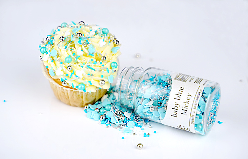 Błyszczące perełki , posypka, oraz confetti w kształcie mickey stanowią wiodący element wystroju deserów, urocze, słodkie, przyciągają wzrok.