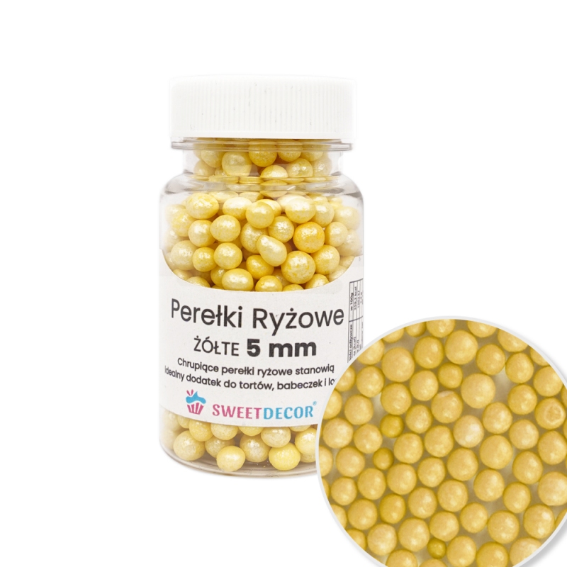 Perełki w kolorze żółtym wykonane z chrupki ryżowej. świetnie nadają się do dekoracji ciast, lodów, deserów oraz pierniczków.