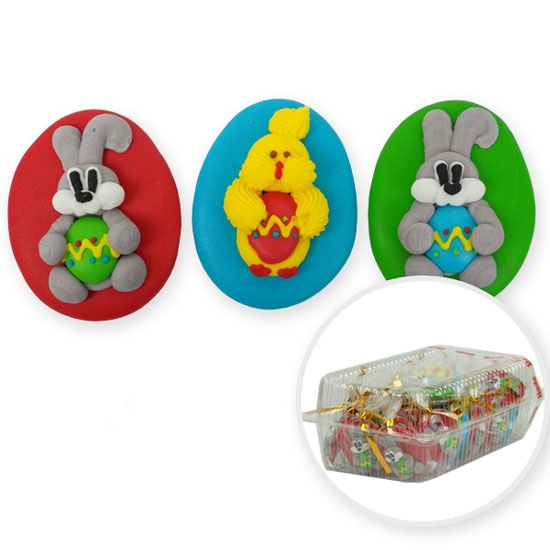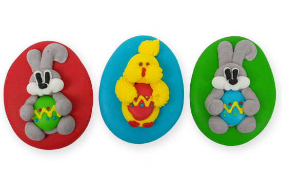Śliczny zestaw dużych płaskich pisanek wielkanocnych z zajączkiem. w 3 kolorach - ta wyjątkowa ozdoba na wielkanocne wypieki, została wykonana z masy cukrowej.