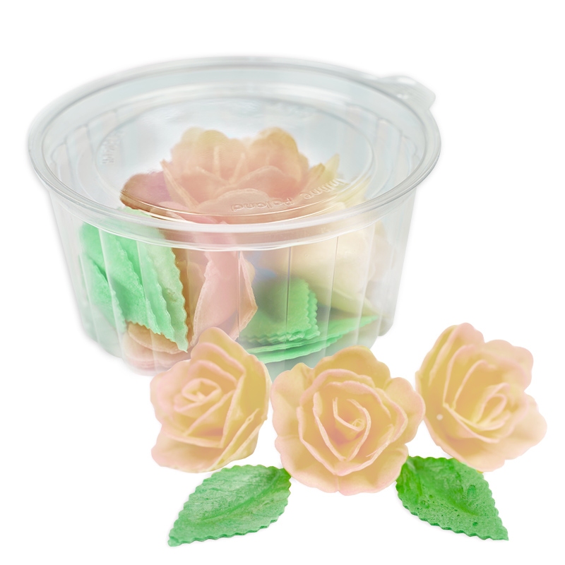 Efektowna dekoracja w kształcie delikatnych róż wykonanych z opłatka dla ozdoby i podkreślenia wyjątkowego charakteru okazjonalnych ciast i deserów.