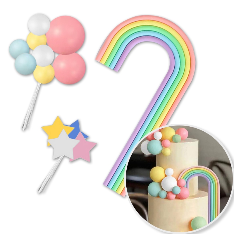 Zestaw dekoracyjny w kształcie kolorowej tęczy, kul różnej wielkości oraz czterech gwiazdek, wykonany z tworzywa.