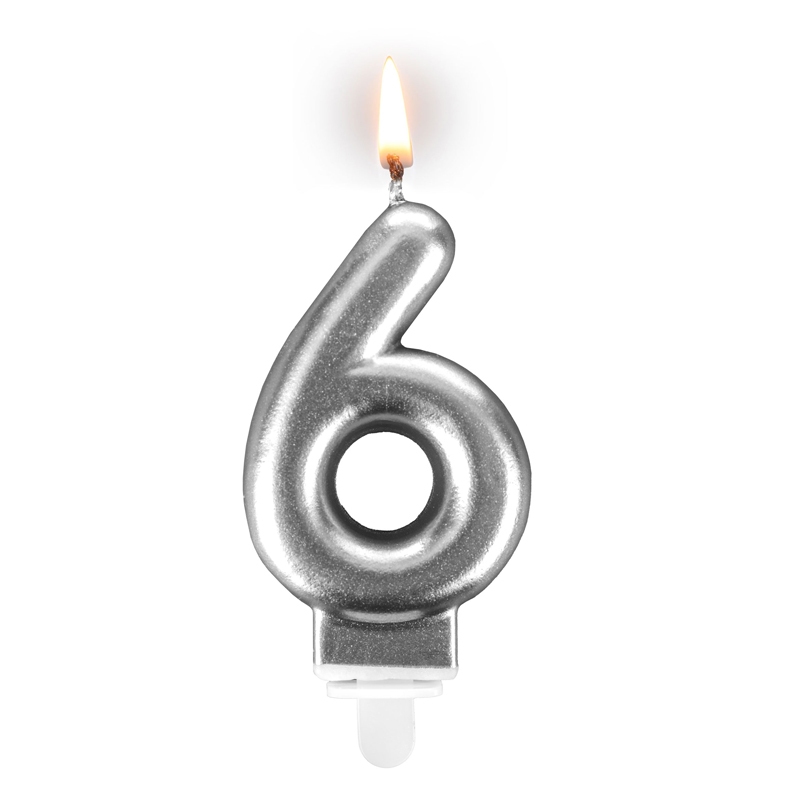 Fantastyczna, elegancka świeczka w kształcie srebrnej cyfry "6".