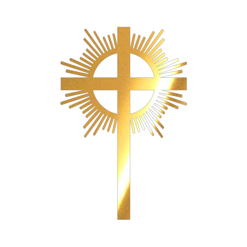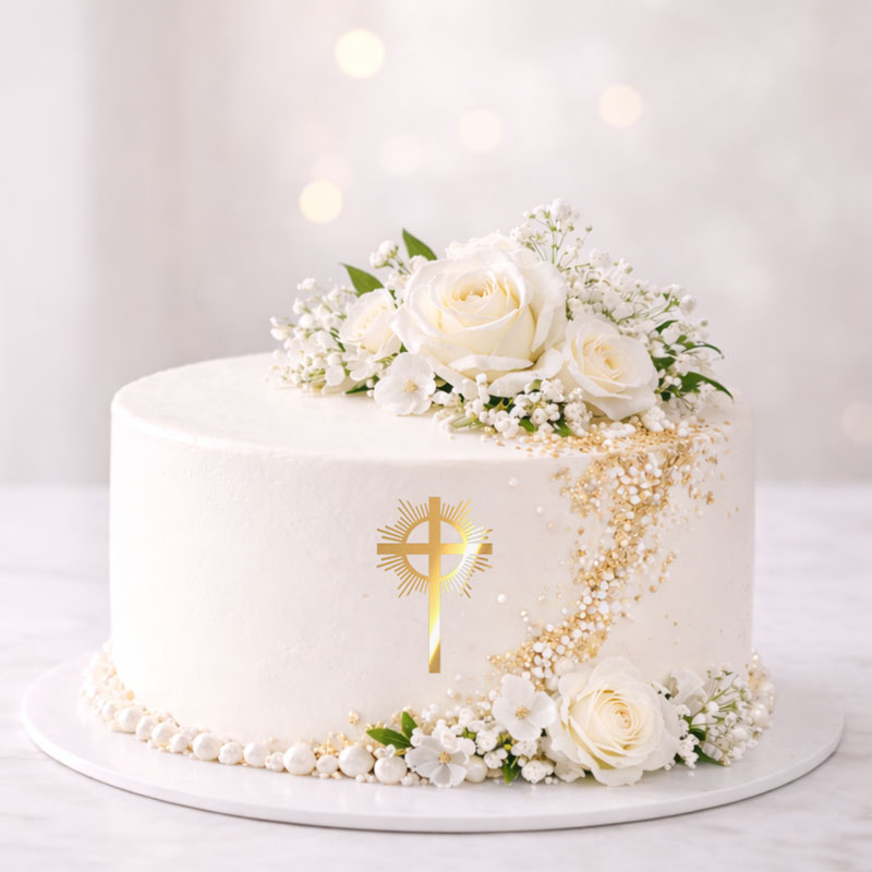 Dekor na tort w kształcie krzyżyka z promieniami, wykonany z lustra złotego - idealnie nada się do udekorowania wyjątkowych komunijnych wypieków dla chłopców jak i dziewczynek. W łatwy sposób wypiek nabierze Komunijnego charakteru.