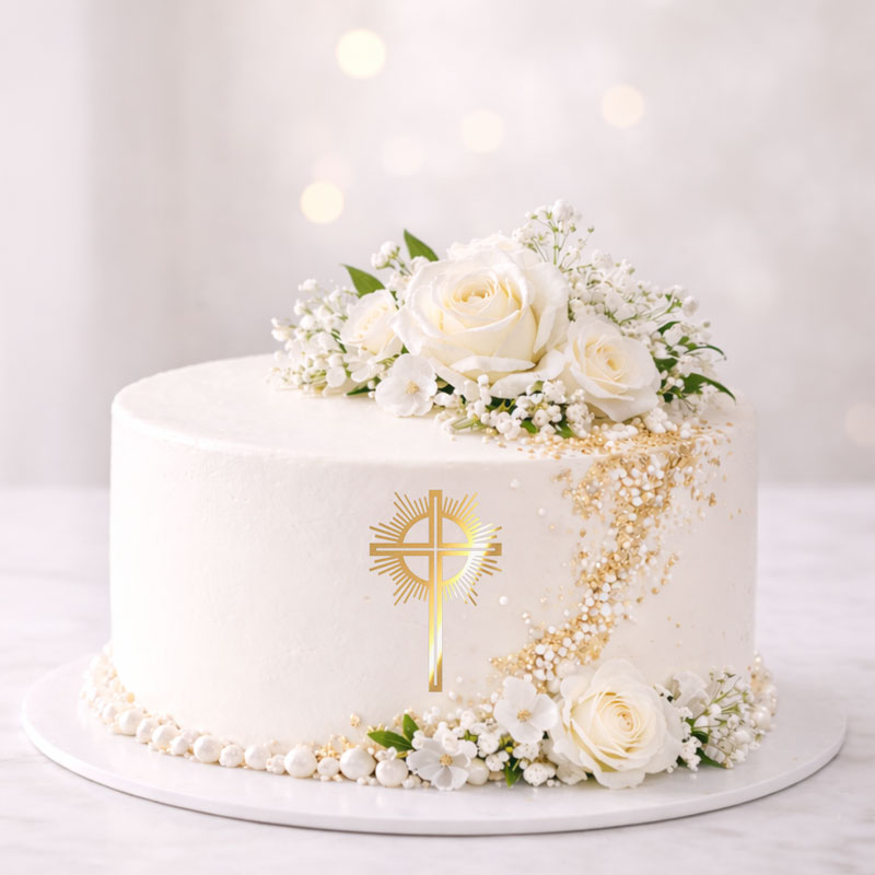Dekor na tort w kształcie krzyżyka z promieniami, wykonany z lustra złotego - idealnie nada się do udekorowania wyjątkowych komunijnych wypieków dla chłopców jak i dziewczynek. W łatwy sposób wypiek nabierze Komunijnego charakteru.