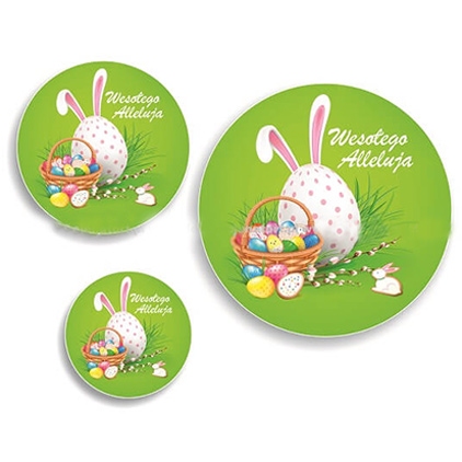 W opakowaniu znajdują się dekoracje tabliczki okrągłe z kolorowymi pisankami oraz napisem "Wesołego Alleluja", kolor zielonego od razu kojarzy się z wiosną.