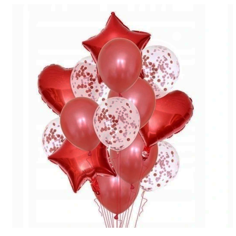 Zestaw składający się z balonów w kolorze czerwonym i transparentnym z czerwonym konfetti, oraz balonu w kształcie gwiazdy. Nadadzą się jako ozdoba do udekorowania miejsca, w którym odbywa się przyjęcie okolicznościowe.