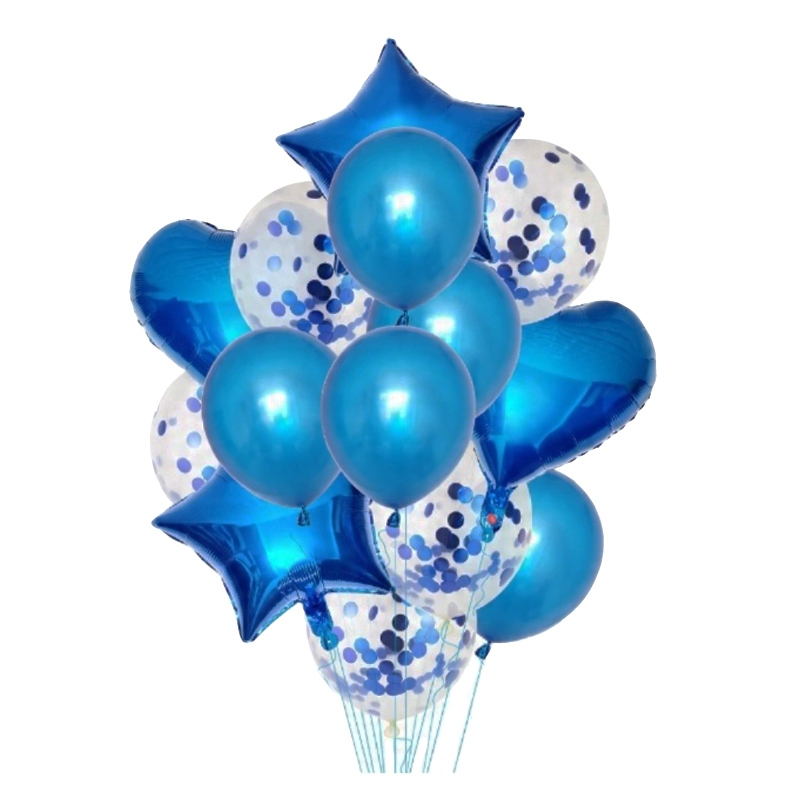 Zestaw składający się z balonów w kolorze niebieskim i transparentnym z niebieskim konfetti, oraz balonu w kształcie gwiazdy. Nadadzą się jako ozdoba do udekorowania miejsca, w którym odbywa się przyjęcie okolicznościowe.