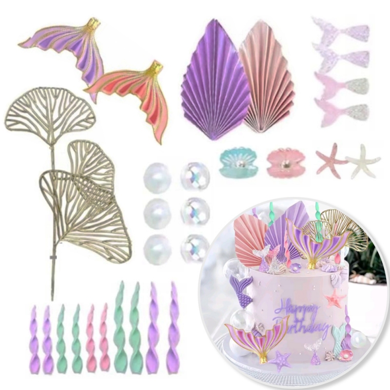 Zestaw figurek i dekoracji składający się w elegancki zestaw w klimacie syren i morskiego świata w którego skład wchodzą: 2x ogon syreny, 2x rozgwiazda, 2x muszla z perłą, 6x perła duża, 4x mały ogon syreny, 2x dekoracja w formie liścia, 10x liść algi (zakręcony).