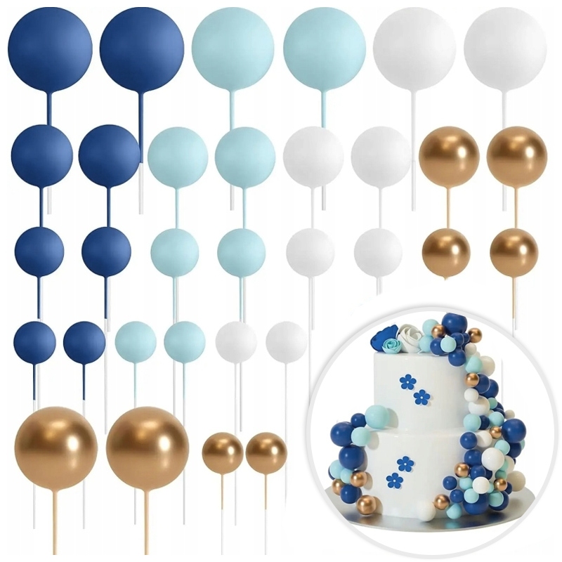 Zestaw składający się z różnej wielkości kul w kolorach: złotym, białym, oraz dwóch odcieni niebieskiego.