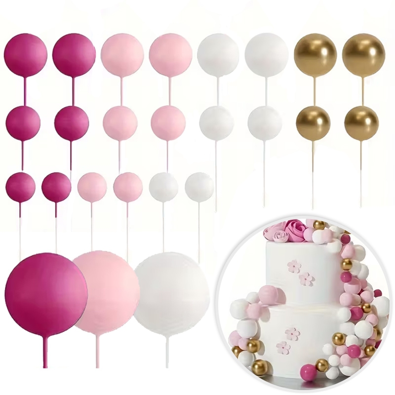 Zestaw składający się z różnej wielkości kul w kolorach: złotym, białym, oraz dwóch odcieni różowego.