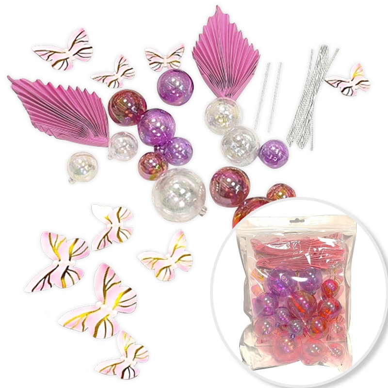 Wachlarze, kule dekoracyjne i motyle - składające się w elegancki różowy zestaw w klimacie eleganckich ale również bajkowych tortów.