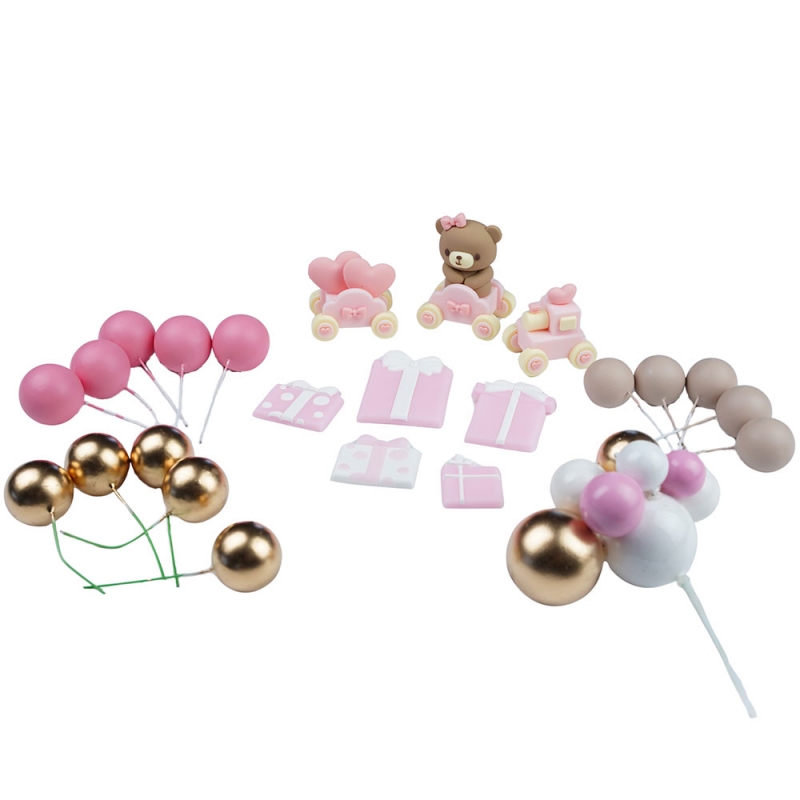 Zestaw dekoracji na tort w krystalicznych kolorach. Komplet z 15szt kuleczek, 1szt pomponiku, 8szt figurek cukrowych