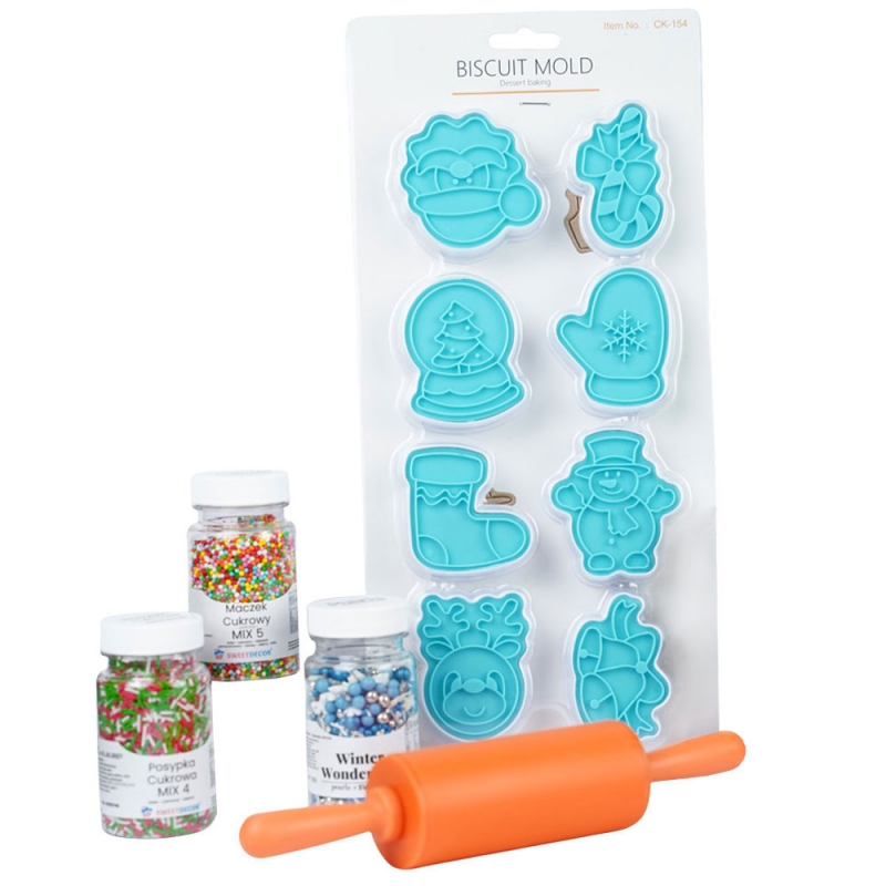 Zestaw świąteczny do pierniczków zawierający plastikowe wykrawaczki świąteczne, 3 różne posypki oraz mini wałek.