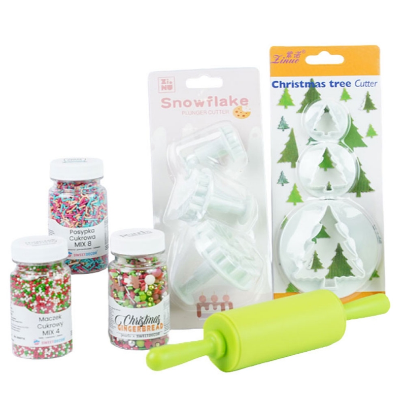 Zestaw świąteczny do pierniczków zawierający wykrawaczki choinki i płatki śniegu, 3 różne posypki oraz mini wałek.
